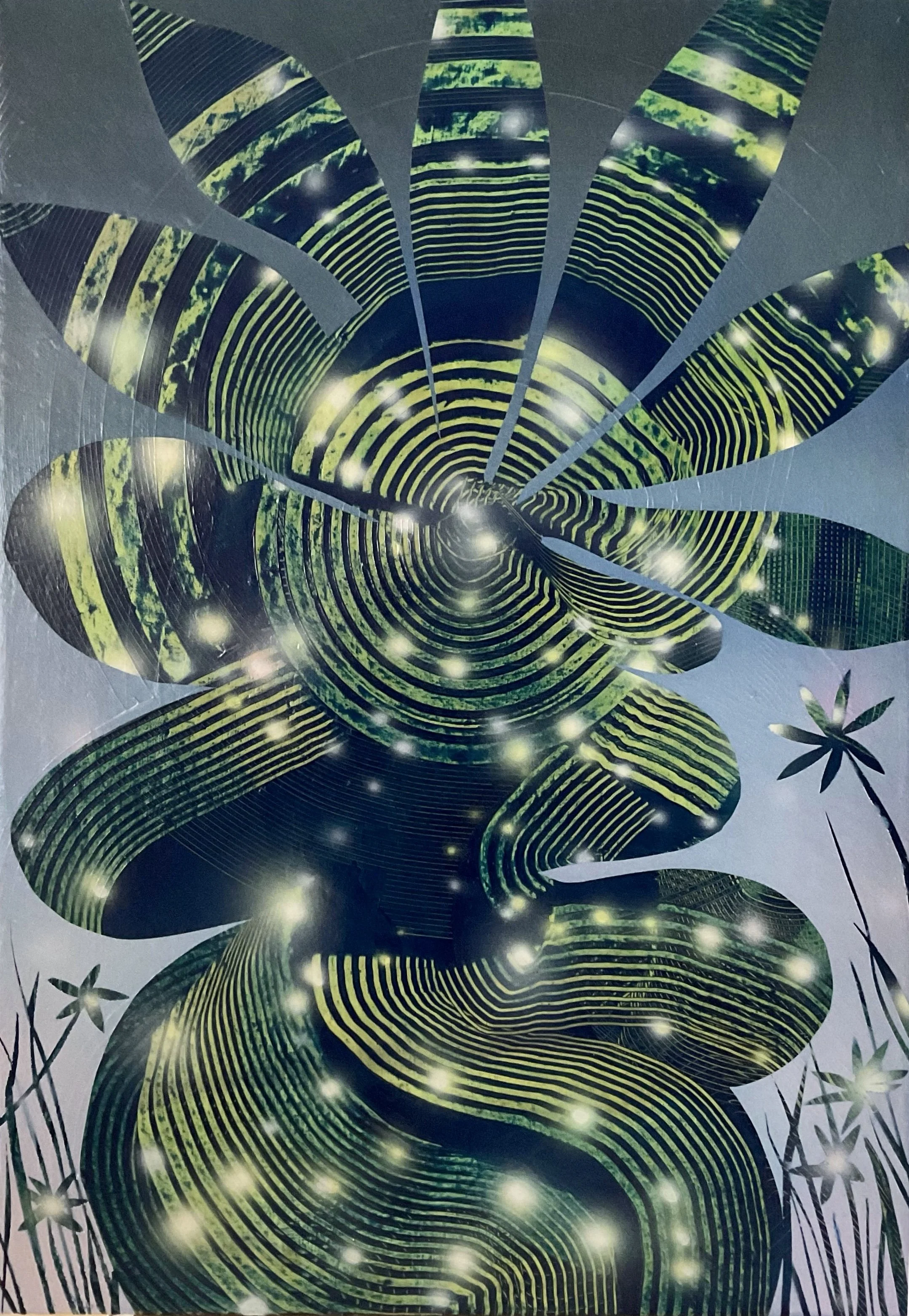 “I’ve always been interested in the poetics of geometric patterning. Lately I’ve been creating layers of linear vector-like lines that overlay and interact with each other. From this improvisational foundation, I begin to organize the surface into more specific shapes that the patterning suggests to me. From these swirling murmurations of line and color, fragments of memories begin to emerge and join together. I attempt to highlight the more compelling areas of patterning by painting out the distracting areas, pushing them back into deep space. Forms emerge that are in between the states of figure and landscape, flora and fauna, mathematic geometry and naturalistic form. These transitional entities are separated out and pushed forward, carved out of a field of paint.”