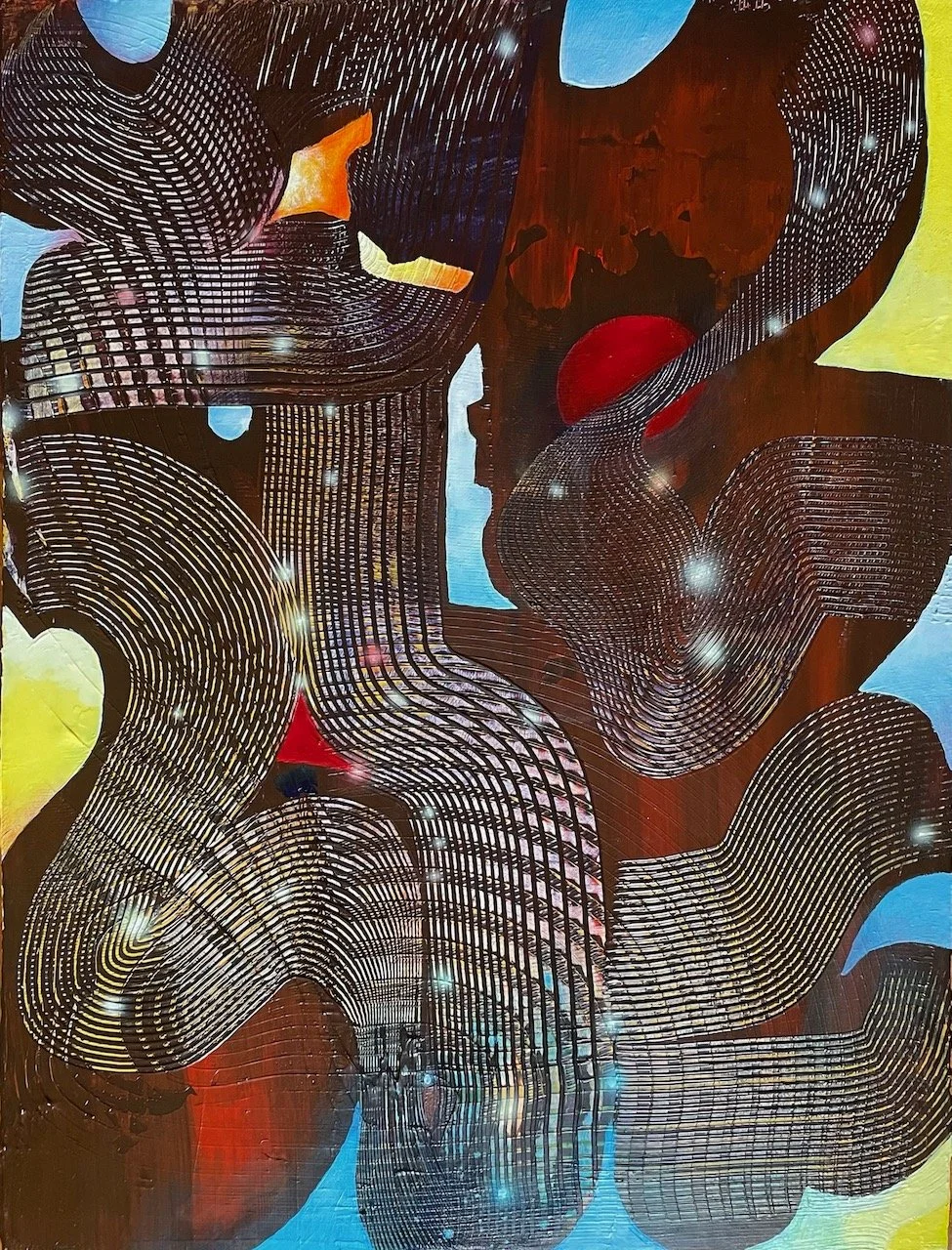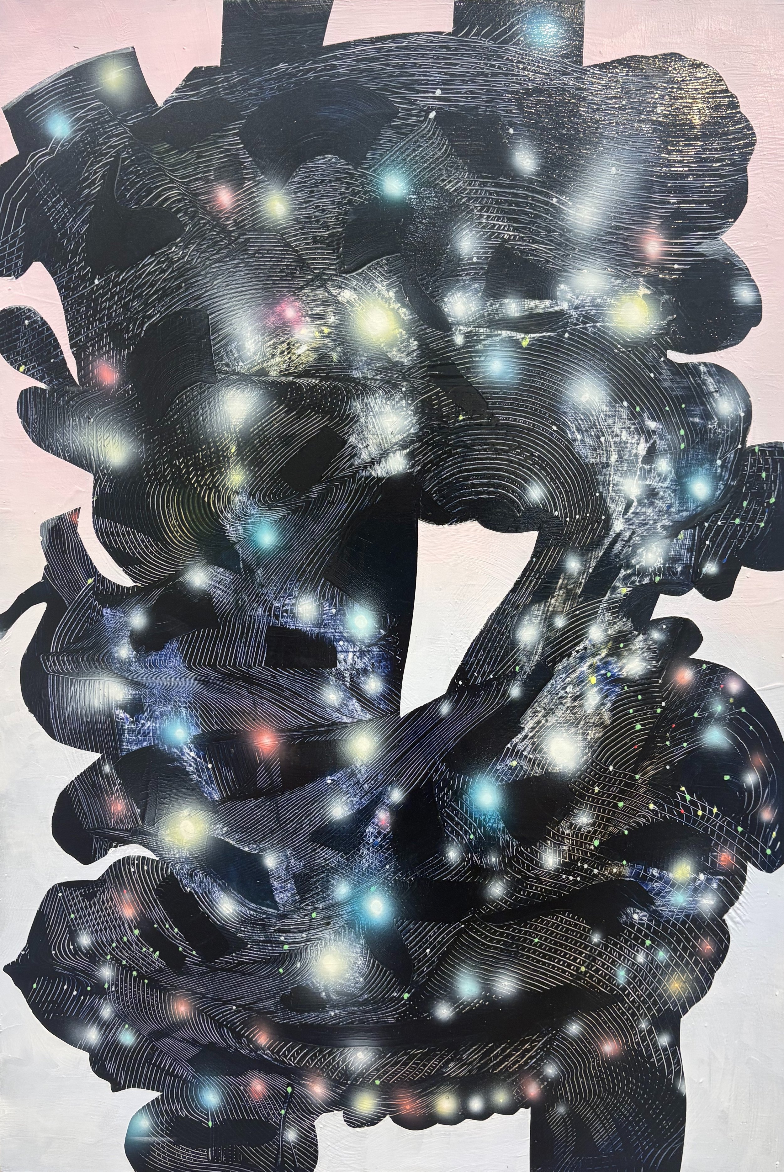 They already had a “stars at night” feel to them at times as well. As I started making patterns again with the combing tools, and the images I made became more and more nebulous and abstract, the airbrushed lighting became much more of a “stars at night” or energy traveling along in conduits, and less of a “city lights” feel. But I still want all of those to be true