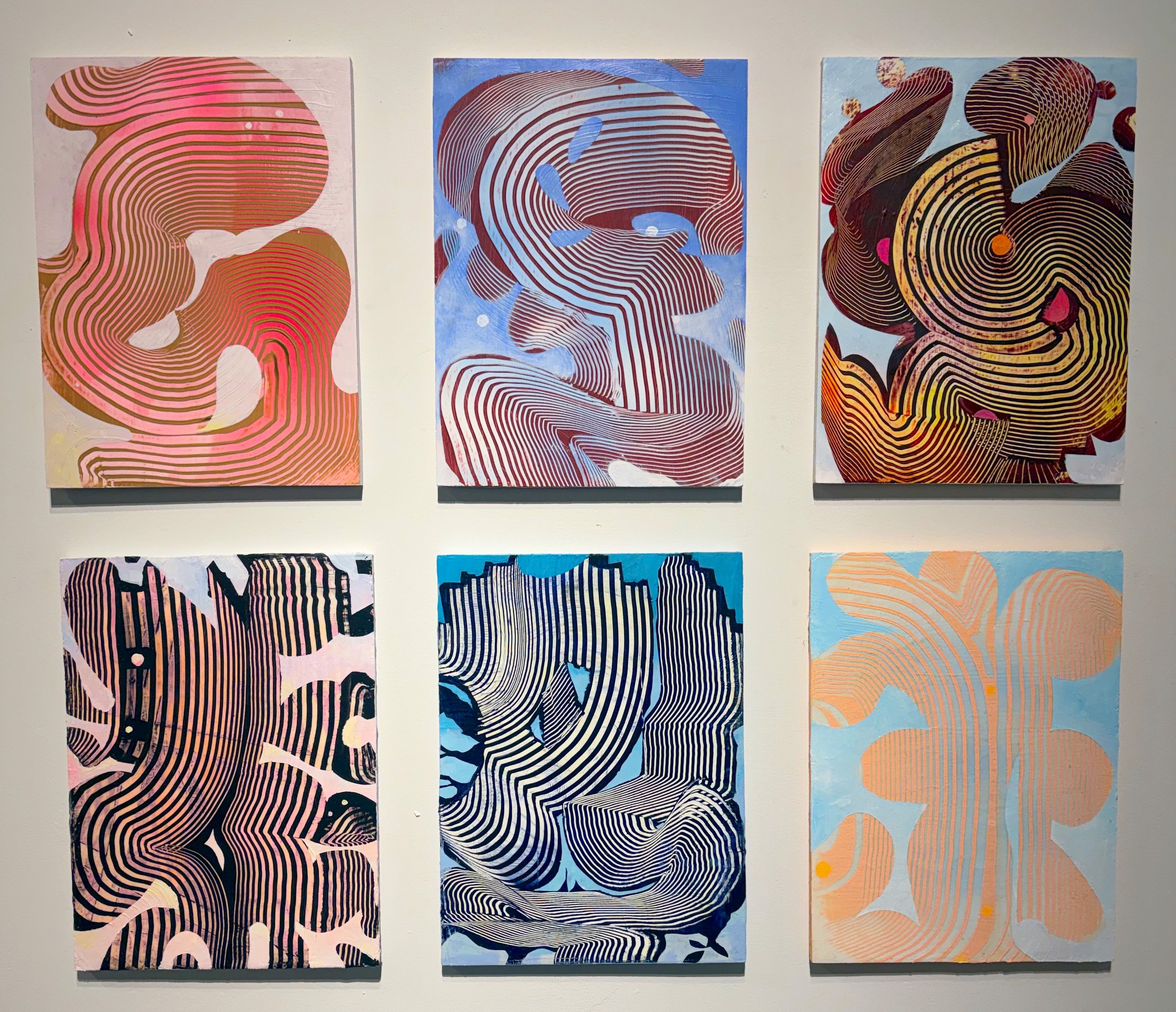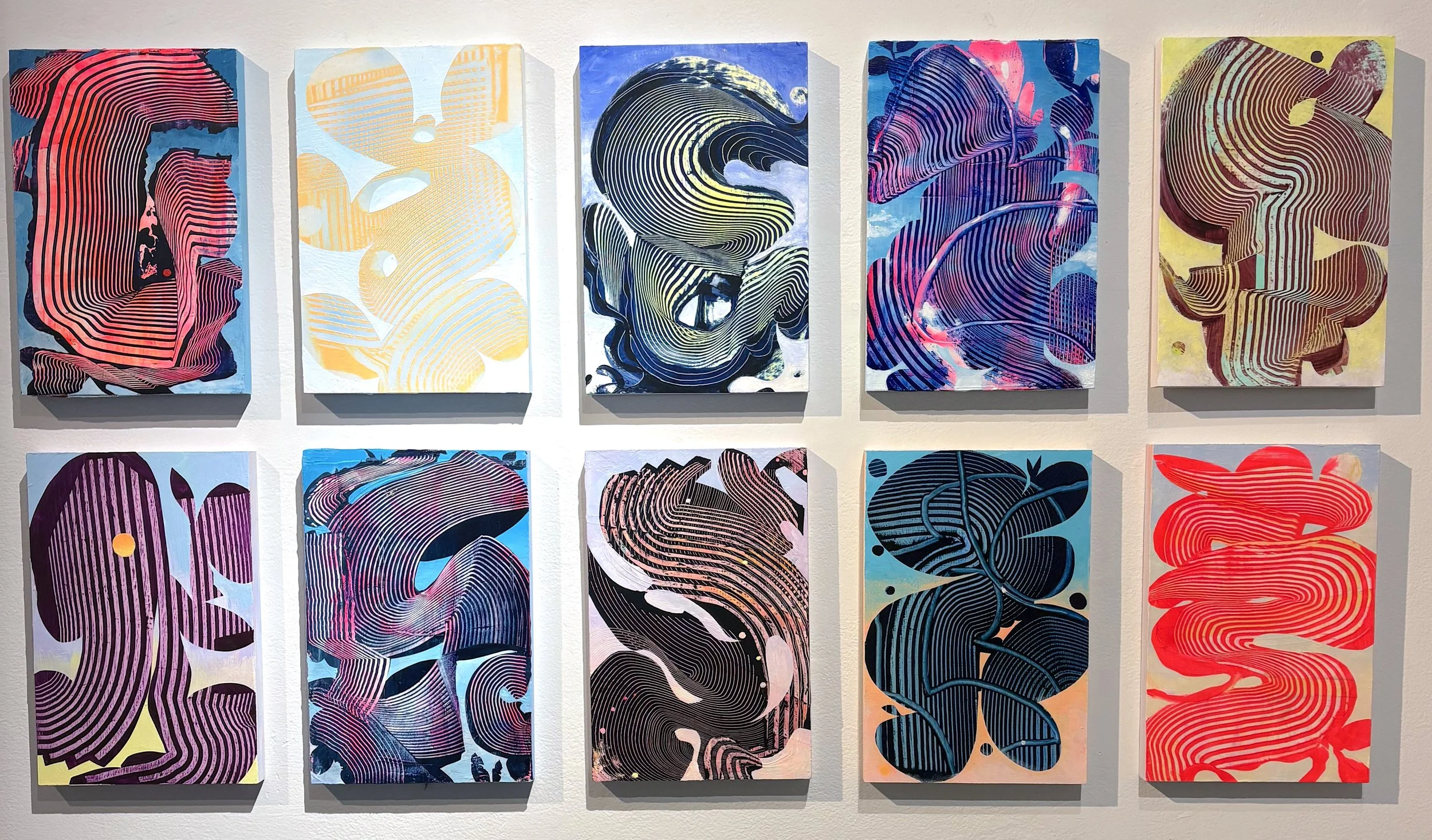 And then there are the most recent works on paper, a body of work I started over last summer, again to allow me to move quickly through ideas and also take up less space than paintings on panels. I make so much work that storage is a constant challenge. I’ve mounted these paintings on paper to panels for this show because I wanted to include them, but they work better with the rest of the show and feel more substantial to me being mounted to panels.