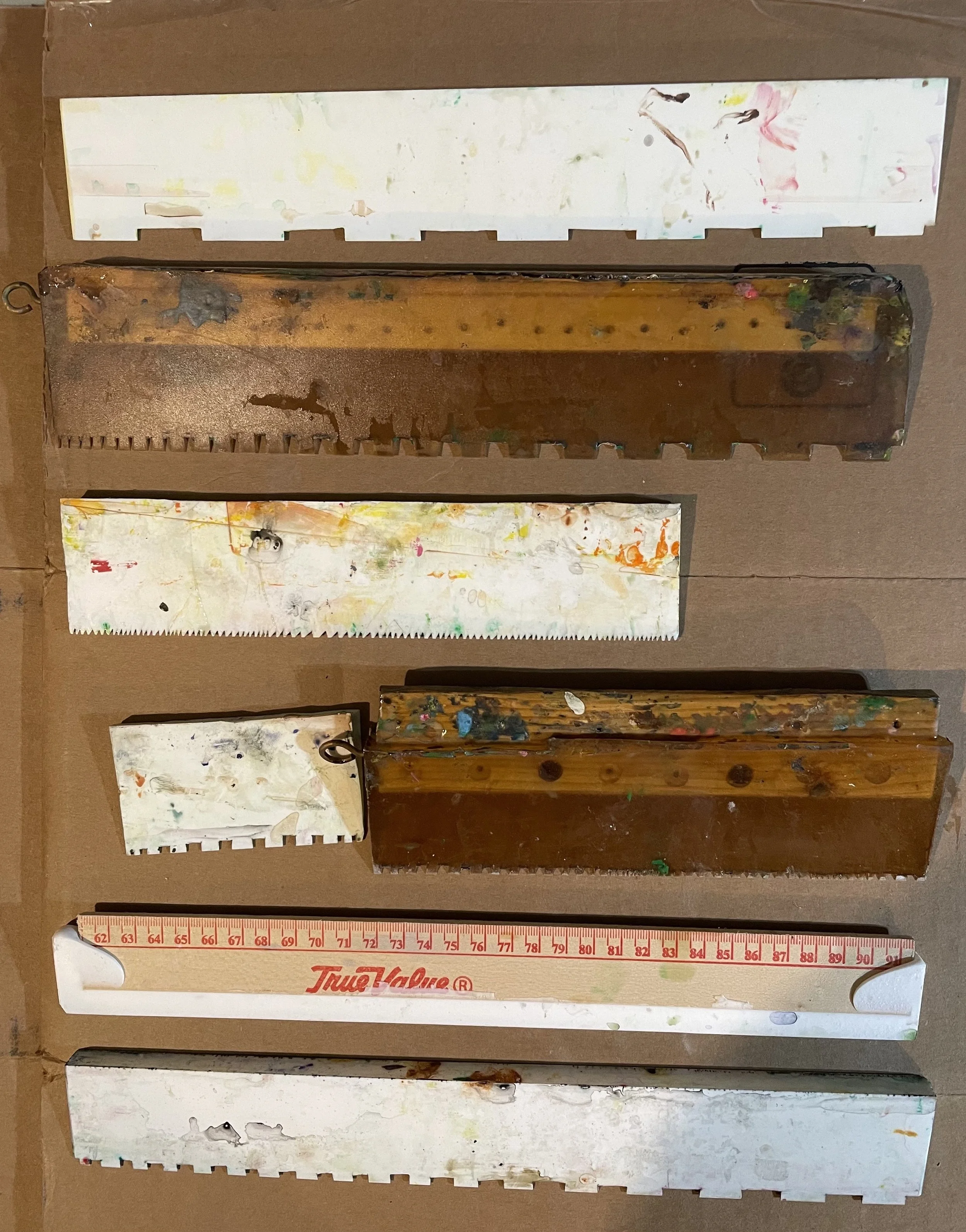 Several of these paintings are wrapped up in my storage rack and have moved with me to a few different studios over the years, but I’d forgotten about them. When I saw these slides I was surprised by how much I liked them and started thinking about how I might be able to revive this old project and use some of the ideas, and the comb tool, and integrate it into my current painting project. So I started experimenting and making new combing tools with various gradations. And now I’m making patterns with these tools again after abandoning the project almost half my life ago.