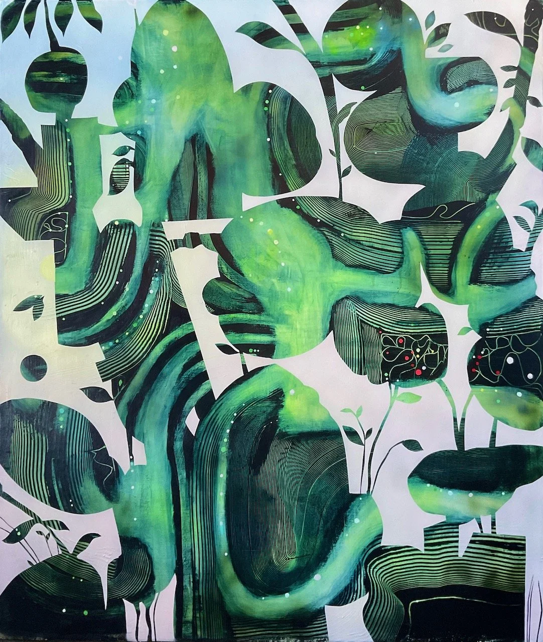 I haven’t talked about the influence of music much, but many of my ideas about patterns, rhythm, growth, flows, improvisation, etc., come out of music. I’m an omnivorous music listener. The way a handful of notes can create intricate structures of thought and feeling mirrors what I want to do with my paintings.